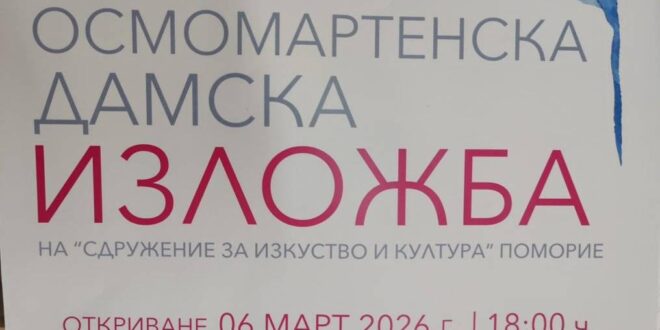 Осмомартенската изложба на поморийските художнички ще бъде открита на 06.08.2026 г. /петък/, от 18.00 ч. в НЧ „Просвета 1888“-Поморие, съобщава Сдружението за изкуство и култура”.