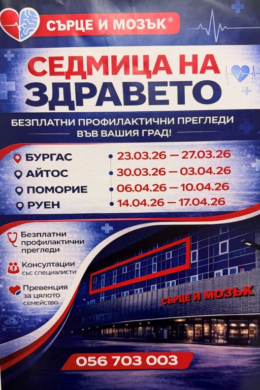 Болница „Сърце и Мозък“ – Бургас идва в Поморие за отбелязване „Седмицата на здравето“. От 6 до 10 април мобилният кабинет на болницата ще бъде позициониран на паркинга пред сградата на Община Поморие.Инициативата „Седмица на здравето“ е свързана с качествената превенция, достъпна за всеки. Водещи специалисти излизат от кабинетите, за да се срещнат с пациенти в мобилна синя шатра.