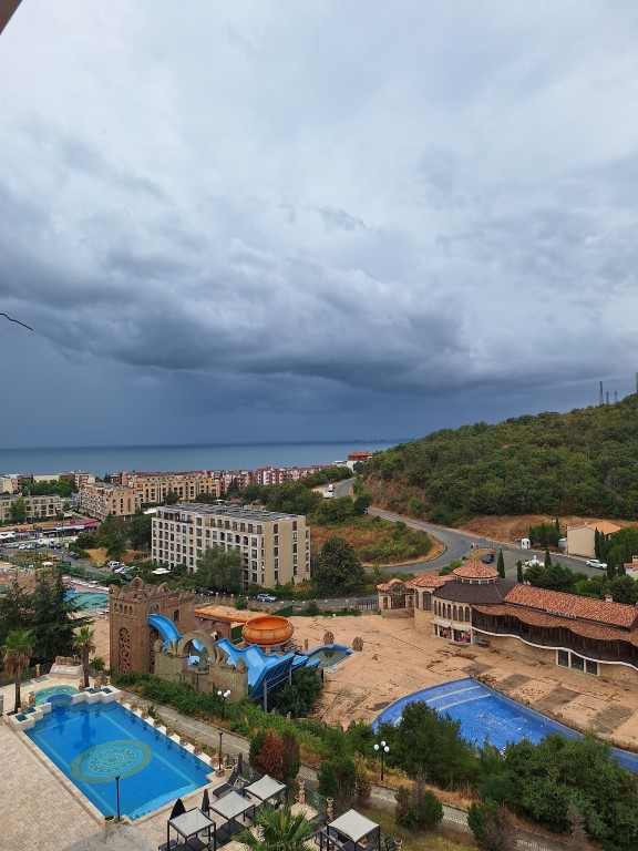 Плажът е изоставен, липсват каквито и да е съоръжения по него, няма спасителни постове. Предполагам, че не е отдаден на концесия. Изпочупени плочки, празни рушащи се басейни и фонтани, излющени фасади, неработещ аквапарк в окаяно състояние допълват мрачната гледка.