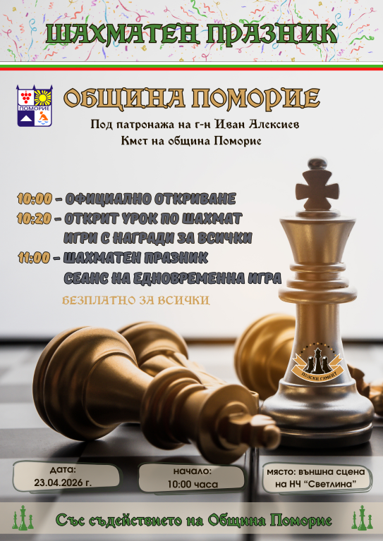 Шахматен клуб „Асеневци“ отново организира мащабно национално шахматно турне. Каузата на турнето е да се популяризира шахът сред подрастващите и да се даде възможност на всеки желаещ да тренира безплатно. За трета поредна година Община Поморие е неизменна част от турнето. На 23.04.2026 г. /четвъртък/ от 10:00 часа в градинката до НЧ „Светлина 1939“ в квартал „Свети Георги“ ще се проведе кръг от Национално шахматно турне „Асеневци“. Събитието ще се проведе под патронажа на кмета Иван Алексиев и участие ще вземат над 100 деца от СУ „Иван Вазов“ и ОУ „Христо Ботев“ – Поморие.