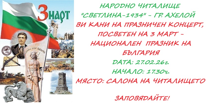 Празничен концерт, посветен на 3 март, Национален празник на България, ще се състои на 27 февруари, от 17,30 ч в салона на НЧ „Светлина 1934“ гр. Ахелой, съобщават от читалището.