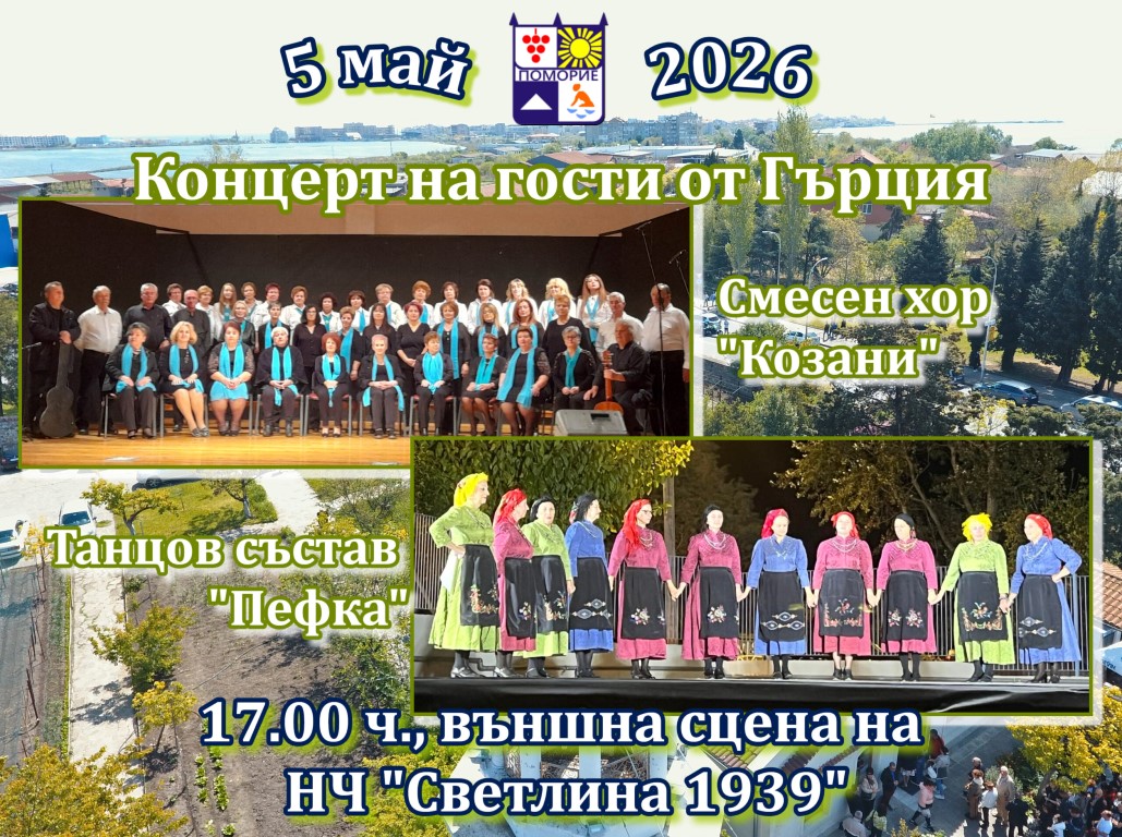 На 5 май /вторник/ жителите и гостите на Поморие ще имат възможността да станат част от една весела гръцка вечер с участието на ансамбли от Гърция, певицата Gini, Агатангелос и бенд. Музикалната програма ще се състои на външната сцена на НЧ „Светлина 1939“, като концертът ще започне в 17.00 часа с гостите ни от Смесен хор от Козани и Танцов състав „Пефка“ от Солун. Смесеният хор на Козани с диригент Вангелис Ветас е основан през 2013 г. за артистично, фолклорно и традиционно пеене. Хорът е участвал в множество събития в цяла Гърция, както и в свои собствени продукции. Танцовият състав от Сдружение „Пефка“ е основан е през 1975 г. с цел да поеме водеща роля в културното развитие на региона. Днес „Пефка“ е пазител на гръцките традиции и участва активно в културни и социални събития. Сдружението се занимава с различни хуманни инициативи. Председател е Димитриос Царцалис, учителите по танци са Хадзихаристу Атанасия и Лазаридис Константинос. От 18.30 ч. програмата ще продължи с поп певицата GINI (Вирджиния Събева) – един артист, който може да разпознаете по открояващия се глас и енергия. Джини е финалист в “X Factor Bulgaria” и “Звездите в нас”, с редица издадени сингли, влизащи в класациите на BG Voice, The voice radio and tv, Coolt BTV, Българските 5 CITY TV, класацията на “Traxsource” за най-слушани хаус хитове в света и други. Малко след чаровната GINI, вечерта ще се нагрее още и с гръцкия певец Agathangelos и бенда му. Агатангелос е композитор, текстописец и музикален педагог – име, познато на българската и гръцката сцена. Заедно със своите музиканти, той ще изпълни авторски, но и любими гръцки хитове.