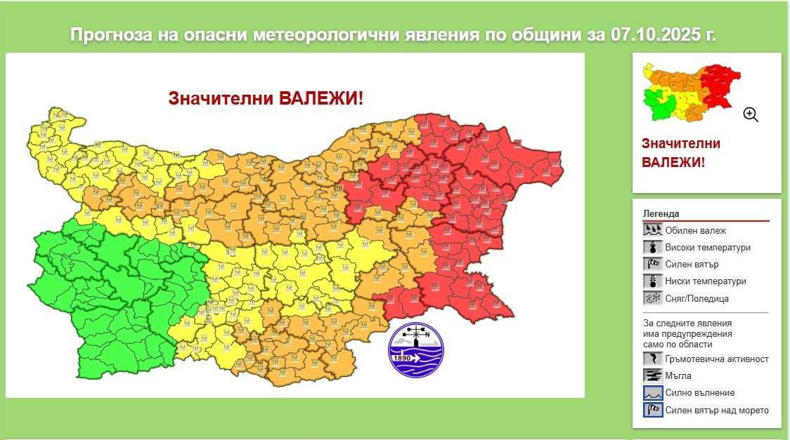 Във връзка с прогнозата на НИМХ за 07.10.2025 г. и очакванията за преминаващ студен атмосферен фронт с интензивни валежи от дъжд, Община Поморие информира, че са предприети следните мерки: кметовете и кметските наместници във всички населени места на територията на общината са предварително уведомени с цел подготовка и недопускане на животозастрашаващи ситуации – проверка на речните легла, деретата, отводнителните канавки по републиканската пътна мрежа и проверка на мостовите съоръжения;