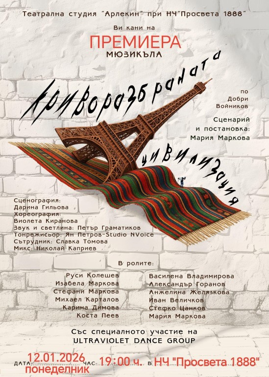 Премиерата на мюзикъла “Криворазбраната цивилизация” по Добри Войников на Театрална студия “Арлекин” е на 12 януари 2026 г./понеделник/, от 19.00 ч. в Читалище „Просвета -1888“ гр. Поморие.