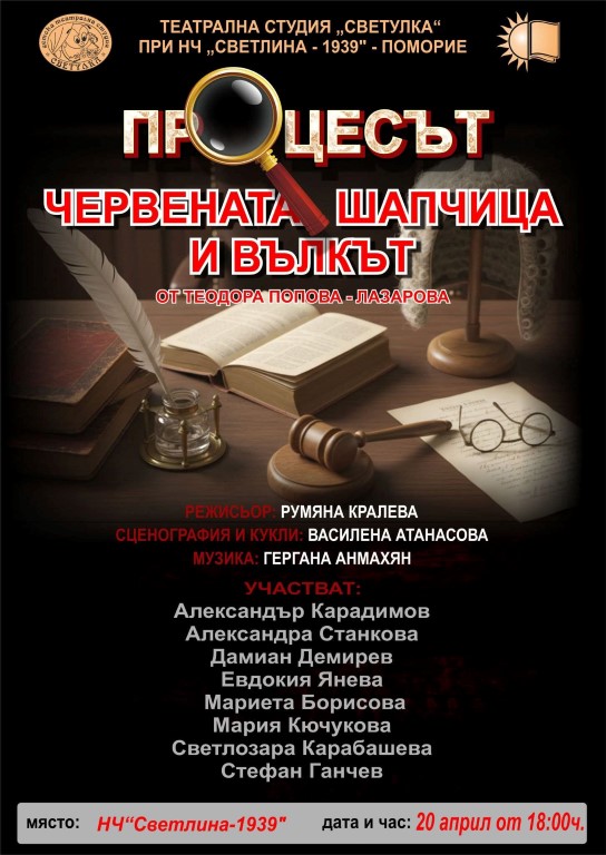 На 20.04.2026 г. e премиерата на куклено-театралния спектакъл „Процесът. Червената шапчица и Вълкът“ от Теодора Попова – Лазарова. Режисьор е Румяна Кралева, Василена Атанасова е сценограф и майстор на кукли, Гергана Анмахян – автор на музиката, а актьорите от ДТС “Светулка“ при НЧ „Светлина -1939“ гр. Поморие са: Александър Карадимов, Александра Станкова, Дамиан Демирев, Евдокия Янева, Мариета Борисова, Мария Кючукова, Светлозара Карабащева и Стефан Ганчев. Повече от 30 години от ДТС “Светулка“ ярко присъстват в културния живот на нашия град и са носители на многобройни национални и международни награди от фестивали и конкурси.